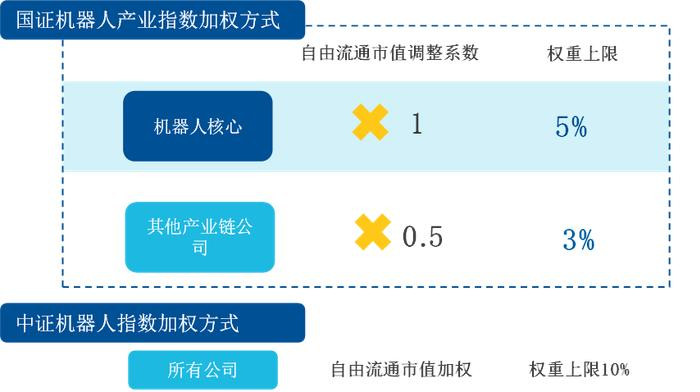 国证机器人产业指数对机器人核心领域公司(核心零部件+机器人本体)给予更高的自由流通市值调整系数,和更高的权重上限,从而使得指数成份权重向市场关注度更高、未来发展空间更大的核心机器人公司倾斜。