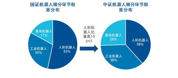 国证机器人产业指数前十大成份股中人形机器人权重达到20.5%,较同类指数高2.4个百分点,且人形机器人公司权重排名更高。