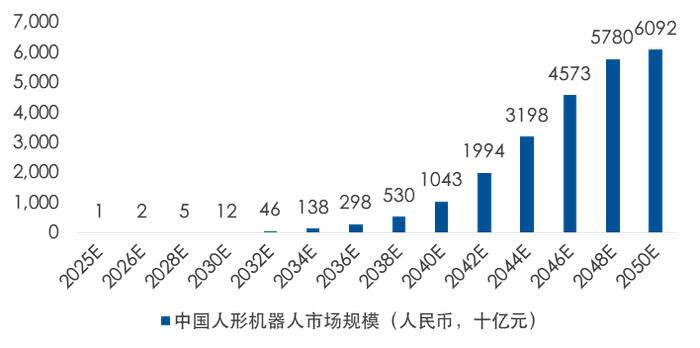 我国人形机器人产业空间正快速打开。据中国信通院预测,2035-2040年,我国人形机器人整机市场规模可达到1000-3000亿元;据摩根士丹利预测,至2050年我国人形机器人市场空间有望突破6万亿元。