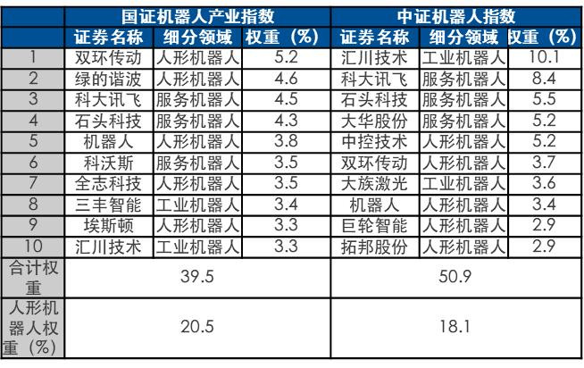 3、前十大成份股中,国证机器人指数人形机器人权重更高。